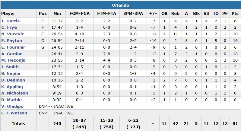 Deuxième victoire de rang pour Atlanta qui, porté par 6 joueurs à au moins 10 points dont Al Horford (15 points à 7/10 et 7 rebonds) et Paul Millsap (13 points à 6/9, 12 rebonds, 6 passes et 2 contres), a facilement dominé Orlando, 98-91.