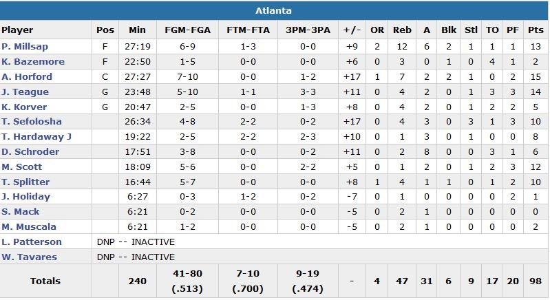 Deuxième victoire de rang pour Atlanta qui, porté par 6 joueurs à au moins 10 points dont Al Horford (15 points à 7/10 et 7 rebonds) et Paul Millsap (13 points à 6/9, 12 rebonds, 6 passes et 2 contres), a facilement dominé Orlando, 98-91.