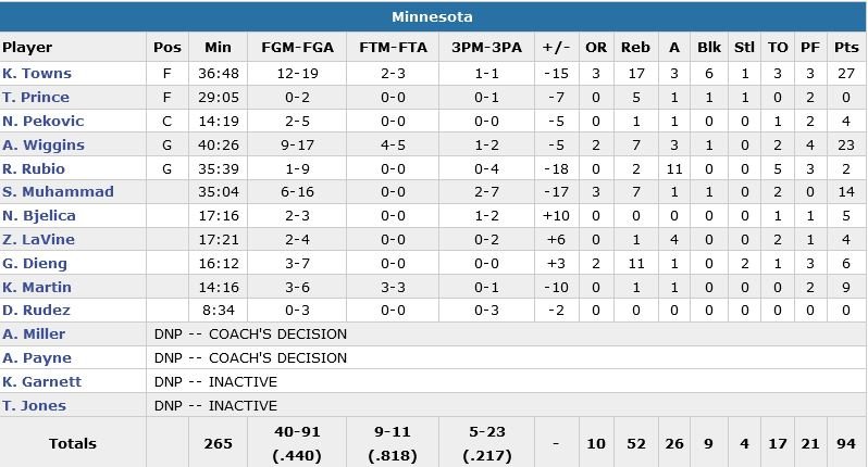 Dallas est revenu d’un déficit de 10 points dans le 4e quart-temps et a su faire face au meilleur match en carrière de Karl-Anthony Towns pour aller chercher une 4e victoire de suite à domicile. Le rookie signe 27 points à 12/19, 17 rebonds, 3 passes et 6 contres sous les yeux de son mentor Kevin Garnett, laissé au repos. Andrew Wiggins termine lui à 23 points à 9/17 et 7 rebonds mais les Wolves, qui s’étaient inclinés malgré une avance de 17 points la veille contre New Orleans, perdent un 11e match en 12 rencontres.