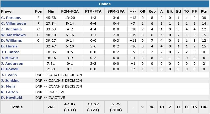 Chandler Parsons a inscrit 7 de ses 30 points en prolongation pour permettre aux Mavericks privés de Dirk Nowitzki (genou droit) de s’imposer 106-94 cette nuit face aux Wolves, 106-94.