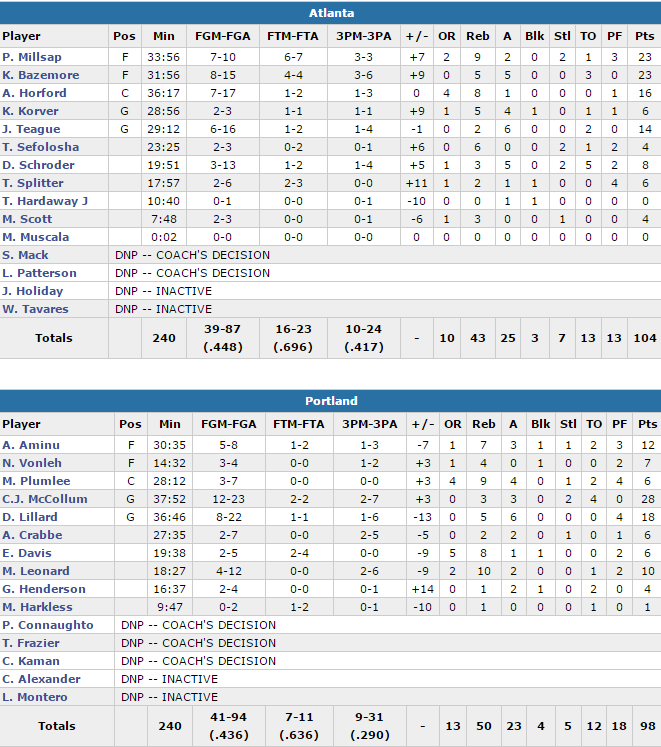 Atlanta a été mené par le duo Paul Millsap (23 points à 7/10 et 9 rebonds) – Kent Bazemore (23 points à 8/15, 5 rebonds et 5 passes), bien aidés par Al Horford (16 points et 8 rebonds) et Jeff Teague (14 points à 6/14). Ils se sont également appuyés sur une bonne réussite extérieure avec un 10/24 et ont tenté tant bien que mal de contenir le duo CJ McCollum (28 points à 12/23 dont 2/7 à trois points) – Damian Lillard (18 points à 8/22 et 6 passes) et de limiter les trois points des joueurs de l’Oregon (9/31).