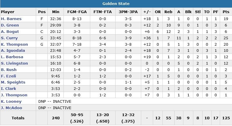Relativement à la peine à 3-points (3/9), Stephen Curry (25 points à 8/18 et 6/6 aux lancers-francs) a compensé en égalant son record de passes cette saison (11) tout en gobant 7 rebonds. Klay Thompson et Harrison Barnes en sont les premiers bénéficiaires avec respectivement 20 points à 7/18 et 5 rebonds et 19 points à 8/13. C’est sans évoquer l’impact de Draymond Green dans le jeu (6 points à 3/8, 10 rebonds et 9 passes) et celui d’un banc étincelant (49 points à 35).