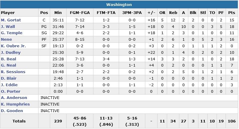 Les Wizards, privés de leur côté de Kris Humphries (genou) et Otto Porter Jr (hanche), n’ont jamais été inquiétés dans ce match, remportant tous les quarts-temps de la rencontre. Ils prendront jusqu’à 24 points d’avance.