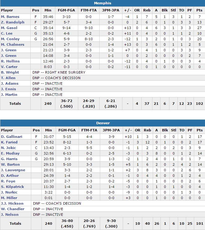 Mike Conley a été précieux avec 20 points à 5/9 alors que Zach Randolph ajoute 13 points. Les Grizzlies ont shooté à 50% et à 24/29 aux lancers tout en ne perdant que 12 ballons. En face Danilo Gallinari a mené Denver avec 17 points mais à 5/15, le même total de Kenneth Faried (à 8/12 et 12 rebonds) alors que Emmanuel Mudiay et Will Barton ajoutent 14 points chacun. Joffrey Lauvergne a eu du temps de jeu et termine avec 9 points à 3/3 et 8 rebonds en 28 minutes.