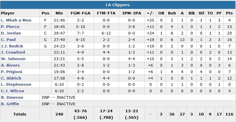 Portés par DeAndre Jordan (20 points à 7/7 et 6/12 aux lancers-francs et 8 rebonds) et Chris Paul (16 points à 6/15, 6 rebonds et 13 passes), Doc Rivers et ses joueurs, restent sur 12 victoires lors de leurs 14 dernières confrontations.