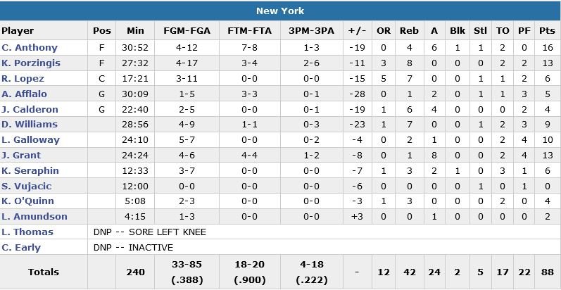 Paul Pierce apporte sa pierre à l’édifice avec 13 points et Los Angeles (7e victoire consécutive face aux Knicks) shoote à 56.6% sur le match. En face Carmelo Anthony n’était pas dans un grand jour avec 16 points à 4/12. Même chose pour Kristaps Porzingis, limité à 13 points à 4/7 et 8 rebonds. New York s’accroche (-5) en début de 2e mi-temps mais les Clippers vont survoler (31-19) un 3e quart-temps interminable (il a duré plus de 30 minutes en raison de replays suite aux fautes intentionnelles sur Jordan mais surtout à l’exclusion de Robin Lopez suite à une altercation avec Pierce et Jordan).