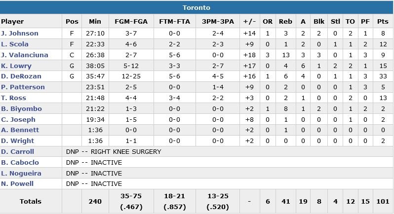 Chris Bosh (9/19, 7 rebonds) et Dwyane Wade (10/20, 13 rebonds et 4 passes) signent respectivement 26 et 22 points mais les absences de Goran Dragic et Hassan Whiteside continuent à se faire sentir pour le Heat (4/17 à 3-points). Toronto a dominé de bout en bout, passant devant 9-2 après un 3-points de James Johnson après seulement 27 secondes de jeu. Auteur de 64 points sur ses 2 précédents matchs, DeRozan en plante 15 dans le 1er quart-temps et les Raptors (12/25 à 3-points) mènent 31-10 après 12 minutes. Les Raptors comptent 16 points d’avance à la pause et c’est la 5e fois de la saison qu’ils inscrivent au moins 60 points en 1ère mi-temps.