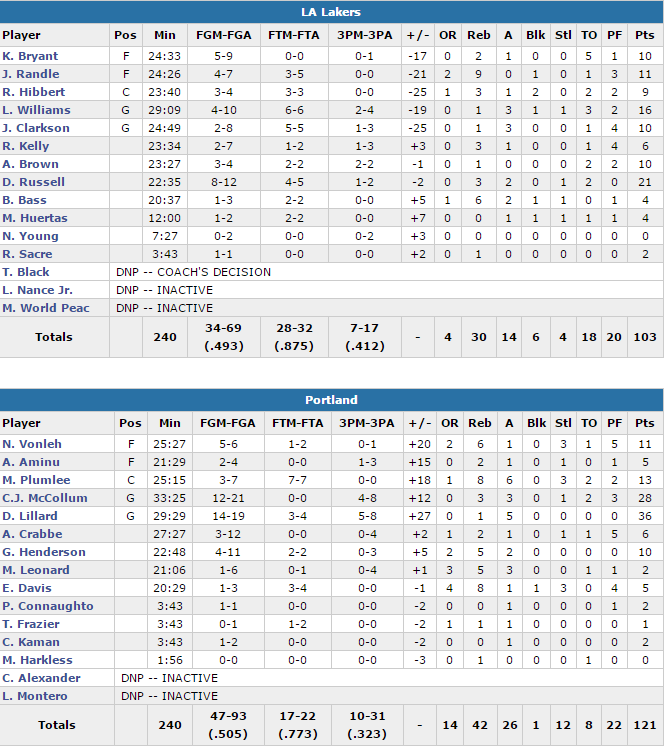 Les hommes de l’Oregon ont été menés par un duo Damian Lillard (36 points à 14/19 dont 5/8 à trois points) – CJ McCollum (28 points à 12/21) intenable. Dans leur sillage les Blazers ont shooté à 50.5%, tout en captant 14 rebonds offensifs (4 aux Lakers) et en ne perdant que 8 ballons. La bonne recette pour un succès facile même si les Lakers ont compté 6 joueurs à au moins 10 points dont 21 pour D’Angelo Russell, 16 pour Lou Williams et 10 pour Kobe Bryant. Ces derniers ont perdu 18 ballons et ont été dominés au rebond.
