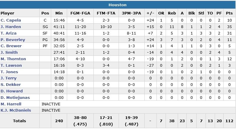 Ariza rentre ses 6 premières tentatives à 3-points et compte 18 points dans le 3e quart-temps, son équipe largement devant 76-60. Sauf que New Orleans passe un 13-3 pour finir la période. Norris Cole rentre un bank shot au buzzer et l’écart n’est plus que d’un point, 93-92. Aucune des deux équipes ne prend ensuite plus de 3 points d’avance dans le 4e quart-temps. Les Pelicans prennent un dernier avantage sur un drive de Jrue Holiday (32 points, 9 passes et 6 rebonds) à 2’17, 109-107. Patrick Beverley enchaîne sur un 3-points et Houston repasse devant 110-109 à 1’09. Harden et Holiday s’échangent 2 paniers et à 28.3 secondes, les Rockets sont toujours devant d’un point, 112-111. La star de Houston perd le ballon sur la possession suivante, récupère le ballon mais shoote un airball en plus de la violation des 24 secondes. Heureusement pour les visiteurs, la dernière défense sur Holiday est impeccable.