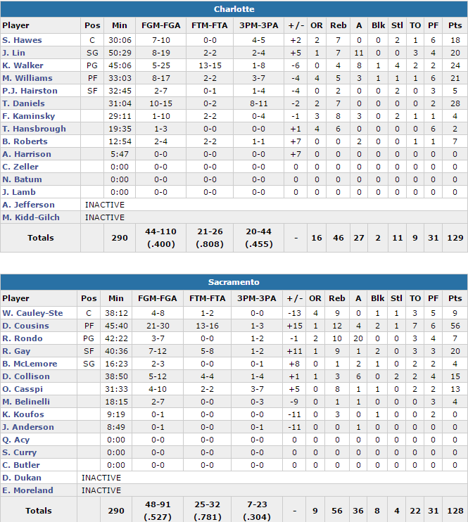 Troy Daniels termine avec 28 points à 10/15 dont 8/11 à trois points alors que Kemba Walker connait une soirée difficile avec 24 points à 5/25 et 8 passes, mais Jeremy Lin (20 points, 7 rebonds et 11 passes), Marvin Williams (21 points à 8/17) et Spencer Hawes (18 points à 7/10) ont compensé en l’absence également de Nicolas Batum et Al Jefferson. Les Hornets auraient pu s’éviter deux prolongations malgré l’énorme match de DeMarcus Cousins, puisqu’après avoir très mal débuté, menés 31-16 après un quart, ils sont petit à petit revenus dans le match et ont pris les commandes à la faveur d’un énorme 3ème quart, remporté 42-28. Devant de 8 points à 9 minutes de la fin ils ont laissé Sacramento faire l’accordéon. Toutefois après un trois points de Daniels et un jump shot de Walker on pensait le match plié avec un score de 107-99 à 3’28 de la fin. C’était sans compter sur DeMarcus Cousins, qui lancé le comeback des siens avec notamment une action à trois points et un trois points. A 5.1 secondes de la fin il pensait même avoir offert la victoire aux siens sur deux lancers pour leur donner un point d’avance mais Walker a été victime d’une faute à moins d’une seconde du buzzer. Il n’a rentré qu’un lancer sur 2 pour envoyer le match en prolongation.