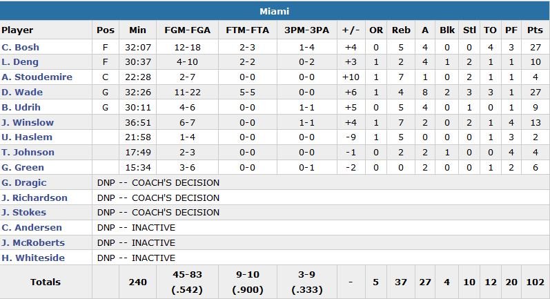 Dwyane Wade (11/22, 4 rebonds et 8 passes) et Chris Bosh (12/18, 5 rebonds et 4 passes) ont signé 27 points chacun cette nuit dans la victoire du Heat 102-98 au Barclays Center.