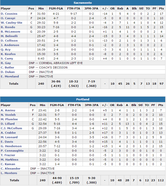 Pas moins de 7 joueurs des Blazers terminent avec au moins 10 points dont 18 pour CJ McCollum, 15 à 5/16 pour Damian Lillard (13 passes décisives). En sortie de banc Gerald Henderson ajoute 15 points à 7/12 et Mason Plumlee un parfait 12 points à 5/5 et 8 rebonds. S’ils ne shootent qu’à 9/30 à trois points les Blazers ont été adroits avec 48.9% aux shoots, ce qui n’a pas été le cas des Kings, limités à 41.9% et 18/32 aux lancers, à l’image d’un DeMarcus Cousins méconnaissable par rapport à ses deux derniers matchs où il avait inscrits 104 points. Il termine à 17 points à 4/21 et 9/17 aux lancers et seulement 5 rebonds. Rajon Rondo ajoute lui 15 points à 7/16 et 11 rebonds et Marco Belinelli 14 points en sortie de banc.