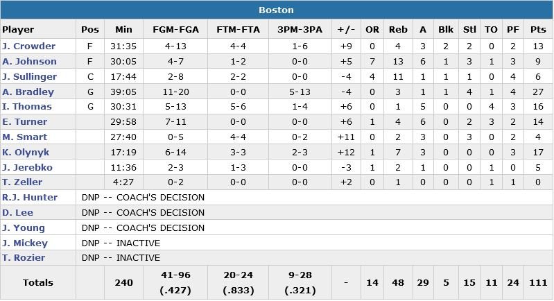 Ils en comptent déjà 15 en 1ère mi-temps et cela se traduit par 15 points offerts à leurs adversaires. Boston prend jusqu’à 13 points d’avance sur les 2 premiers quarts grâce à un Bradley en feu avec un 8/13 aux tirs et 5 3-points qui rattrape la maladresse de ses coéquipiers (11/35 combiné pour le reste de l’équipe).
