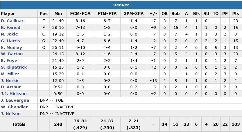 Amir Johnson était quant à lui en mode Draymond Green avec 9 points à 4/7, 13 rebonds, 6 passes et 3 interceptions alors que Danilo Gallinari et Will Barton terminent tous deux à 23 points pour Denver, qui encaisse là une 4e défaite en 5 rencontres. Kenneth Faried est en double-double (15 points, 15 rebonds) mais les Nuggets paient cher leurs 20 ballons perdus.
