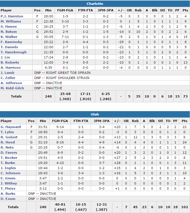 Utah a été mené par le duo Rodney Hood (24 points à 8/16) – Gordon Hayward (22 points à 9/14). Rudy Gobert ajoute lui 6 points, 12 rebonds et 3 contres et Derrick Favors sort du banc pour marquer 12 points à 6/9 en 21 minutes. S’ils ont été efficaces en attaque avec 49.4% aux tirs et seulement 10 ballons perdus, ils ont fait la différence en défense en étouffant Charlotte, limité à 36.8% et 18 ballons perdus. Le retour de Nicolas Batum, auteur de 6 points à 2/9 et 10 rebonds, n’a rien changé pour Charlotte, mené par les 15 points de Kemba Walker, seul joueur avec Brian Roberts (13 points) à atteindre la barre des 10 points