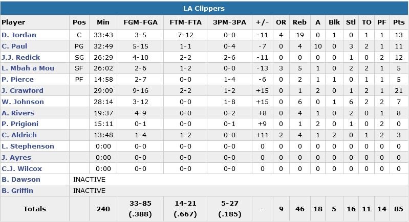 Dans ce match où les 2 équipes étaient clairement fatiguées (road trip d’une semaine à l’ouest pour les Hawks, série de 5 matchs à l’est dont un à Indianapolis la veille pour les Clippers), Atlanta a en effet récupéré un ballon pour forcer 5 minutes supplémentaires à 6.7 secondes après une perte de balle de Chris Paul (11 points à 5/15, 4 rebonds et 10 passes) mais Paul Millsap rate un runner au buzzer et assiste à la 14e victoire en 17 matchs de Los Angeles. DeAndre Jordan termine à 13 points et 13 rebonds et a fait payer ses adversaires aux lancers-francs avec un 6/8 dans le 4e quart-temps.