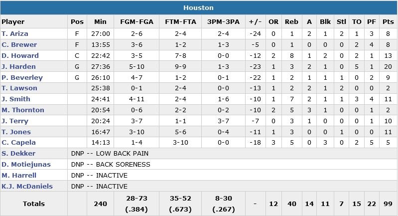 Les Spurs comptent désormais 34 victoires d’affilée à domicile si l’on remonte à la saison dernière. Ils distribuent 32 passes et shootent à 56% sur cette rencontre, mettant fin à la série de 3 victoires de leurs voisins, portés par un petit duo James Harden (20 points à 5/10 et 9/9 aux lancers-francs, 3 rebonds, 2 passes) – Dwight Howard (13 points à 3/5, 8 rebonds et 2 contres, limité à 22 minutes en raison de sa cheville gauche encore fragile).