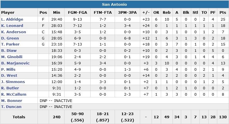 Les Spurs jouaient de leur côté sans Tim Duncan pour un 2e match d’affilée (genou droit douloureux) mais cela n’a pas empêché son équipe de remporter un 17e match d’au moins 20 points cette saison (record). Houston prend 69 points dans la face en 1ère mi-temps avec un Danny Green chaud bouillant de loin (5/7 à 3-points) qui permet aux siens de mener de 20 points à la pause. Il termine à 18 points à 6/8 derrière la ligne. Kawhi Leonard ajoute 18 points et Tony Parker 15 points et 7 passes.