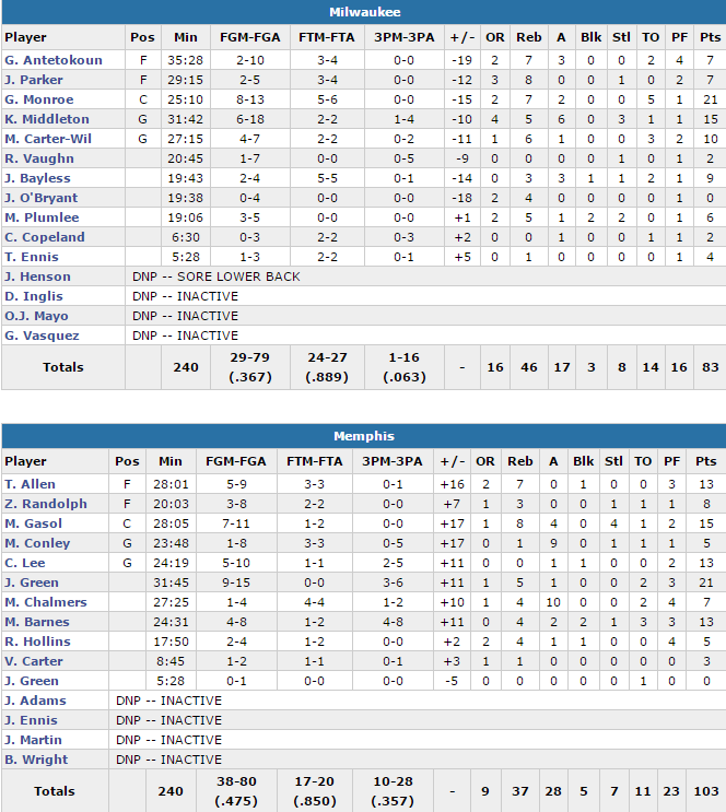 Jeff Green a mené l’équipe avec 21 points à 9/15 en sortie de banc alors que Marc Gasol ajoute 15 points à 7/11, 8 rebonds, 4 passes et 4 interceptions. Matt Barnes, Tony Allen et Courtney Lee signent eux 13 points chacun. Les Grizzlies ont limité les Bucks à seulement 36.7% au tir dont un catastrophique 1/16 à trois points alors qu’eux en rentrent 10 sur 28 tentatives. Greg Monroe surnage avec 21 points à 8/13. Khris Middleton ajoute lui 15 points.