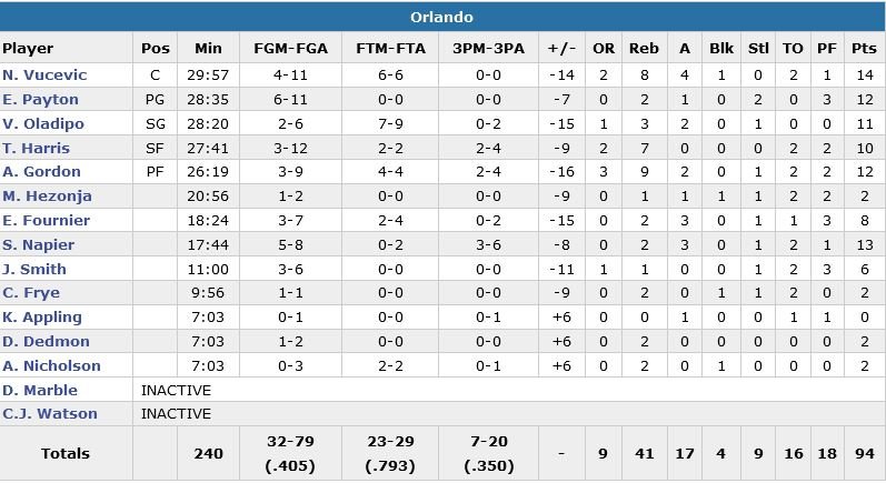 Boston a pris le contrôle en début de 4e quart-temps grâce à un 22-4 qui va leur permettre de pousser leur avance jusqu’à 27 points. Mené par un petit Nikola Vucevic (14 points et 8 rebonds) et 13 points de Shabazz Napier, le Magic a eu du mal toute la soirée en attaque, commettant 16 ballons perdus menant à 22 points de leurs adversaires et shootant à 40.5% contre 50% pour les locaux.