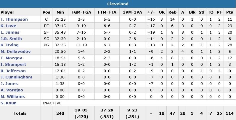 Les Cavaliers répondent aux attentes de leur nouveau coach Tyronn Lue depuis 3 rencontres avec 114 points minimum marqués sur leurs 3 derniers matchs. Devant 66-58 derrière 19 points de Kevin Love, Cleveland inscrit les 7 premiers points du 3e quart-temps, qui se conclut sur le score de 96-78. Detroit revient à 9 points dans le 4e quart-temps mais Reggie Jackson, en échec à 3-points, manque l’occasion de réduire encore à l’écart, laissant les visiteurs filer vers la victoire.