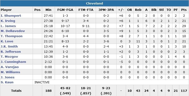 San Antonio réagit en inscrivant les 8 premiers points du 3e quart-temps mais Cleveland répond en usant de sa profondeur offensive. Love et Matthew Dellavedova (15 points à 6/10, 5 rebonds et 3 passes) rentrent chacun un 3-points et James (16 points dans la période) ajoute quelques paniers dans la peinture pour recreuser l’écart, 88-69. Irving et Dellavedova se partagent ensuite les 18 premiers points (respectivement 10 et 8 points) de Cleveland dans le 4e quart-temps et comme un symbole, James enchaîne sur un and one en alignant Patty Mills comme une quille de bowling dans sa course. Game over.