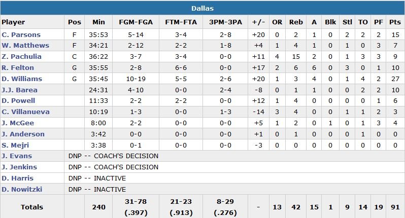 À noter : Markieff Morris a été le seul joueur de Phoenix à marquer dans le 4e quart-temps. Tyson Chandler signe 12 points et 13 rebonds et son remplaçant dans le Texas Zaza Pachulia manque de peu son 22e double-double avec 9 points et 15 rebonds.
