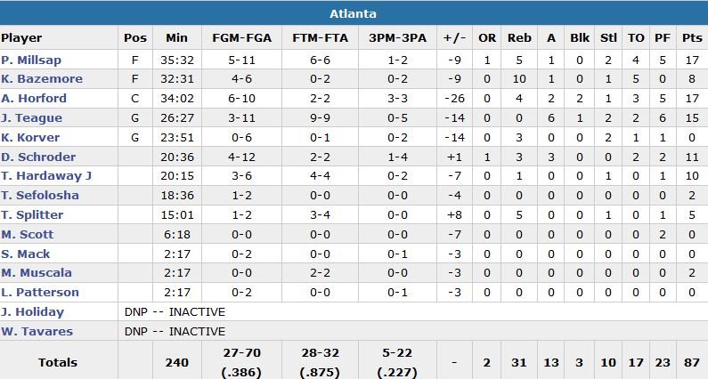 Paul Millsap et Al Horford terminent à 17 points chacun et Jeff Teague et Dennis Schröder à respectivement 15 et 11 unités pour des Hawks dominés 47-31 au rebond et 48% de réussite aux tirs à 39. Miami rate ses 10 derniers shoots de la 1ère mi-temps mais cela n’empêche pas les locaux d’être devant 47-34 à la pause. Les Hawks ne shootent qu’à 28% sur les 24 premières minutes. Atlanta réduit l’écart de 22 à 9 points en fin de 3e quart-temps mais Miami (58 points en seconde mi-temps) reprend rapidement 13 points d’avance avant de jouer le 4e et ne sera plus inquiété à partir de là.