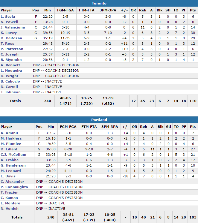 Comme souvent c’est le duo Kyle Lowry (30 points à 10/19 dont 7/10 à trois points, 6 rebonds et 8 passes) – DeMar DeRozan (29 points à 11/25 et 5 rebonds) qui a mené la danse. Jonas Valanciunas ajoute 14 points et 11 rebonds et les remplaçants Terrence Ross et Cory Joseph marquent 12 points chacun. Les Canadiens shootent à 12/19 à trois points, mieux que les Blazers, limités à 10/25. Ces derniers ont été menés par leur backcourt Damian Lillard (27 points à 8/20 et 11 passes) – CJ McCollum (21 points à 8/18), mais c’est celui de Toronto qui a eu le dessus. A noter les 17 points d’Allen Crabbe en sortie de banc.