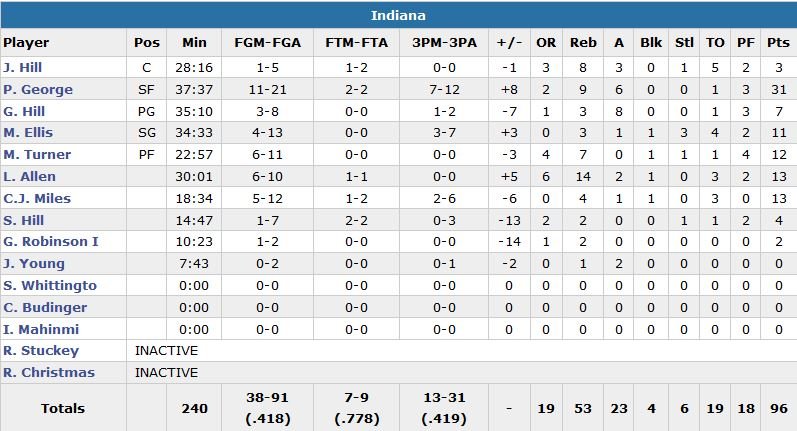 Indiana a désormais perdu 17 de ses 19 dernières rencontres de saison régulière à Atlanta. Millsap score 14 points dès le 1er quart-temps mais ce sont les Pacers qui sont devant 29-26 après 12 minutes. Indiana n’inscrira ensuite pas plus de 24 points dans les 3 quarts-temps qui vont suivre. Menés d’un point 73-72 à la fin du 3e quart, les Pacers vont rater leur 6 premiers shoots du 4e avant que C.J. Miles ne porte le score à 78-74 sur un runner à 8 minutes de la fin. George à 3-points maintient un score serré et pour la dernière fois du match à l’avantage d’Indiana à 4’49, 86-84. Il en rentre un autre à 1’02 pour aider son équipe à revenir à 2 points.