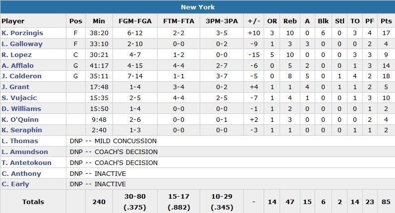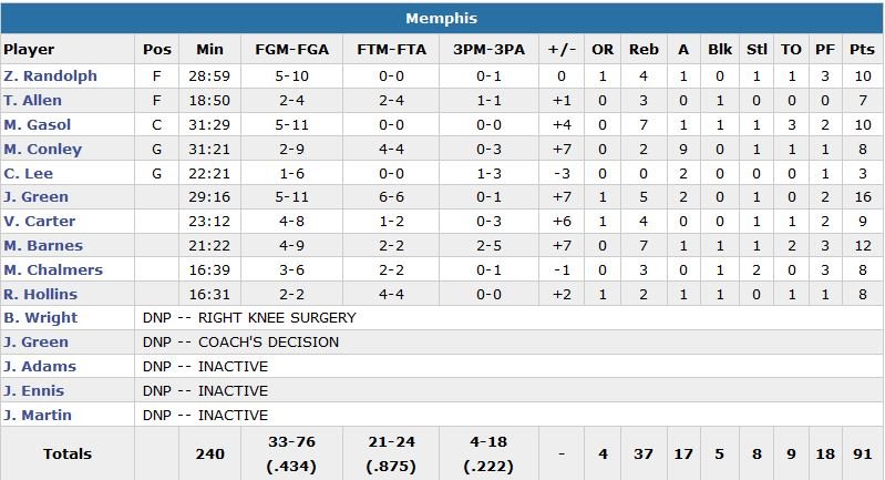 Matt Barnes ajoute 12 points, Zach Randolph et Marc Gasol 10 chacun pour Memphis tandis que Jose Calderon est le meilleur marqueur de New York avec 18 points. Les Grizzlies inscrivent les 10 premiers points du match et mènent 24-18 après un quart-temps mais se prennent un 13-4 d’entrée dans le 2e quart-temps, période durant laquelle les Knicks vont prendre leur seul avantage du match. Memphis use ensuite d’un 22-9 pour rentrer au vestiaire confortablement, 50-40.