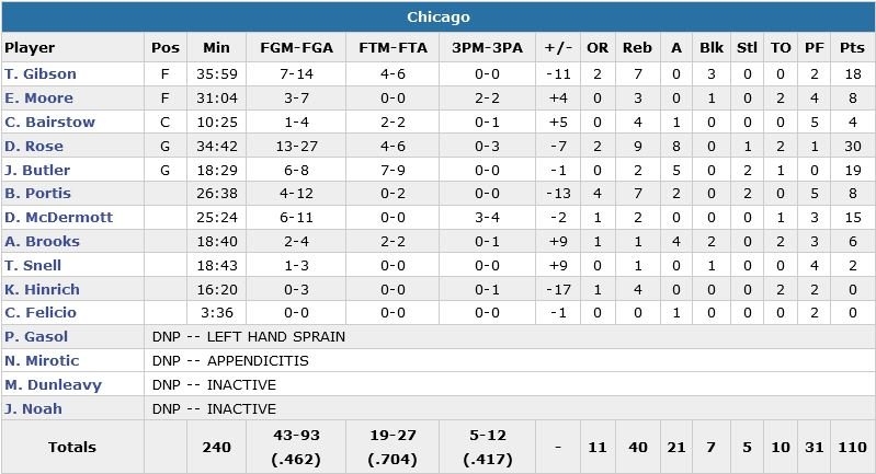 Emmanuel Mudiay ajoute 22 points et Will Barton 18 alors qu’en face, Derrick Rose était partout : 30 points à 13/27, 9 rebonds et 8 passes. Butler marque 19 points avant de sortir et Taj Gibson complète avec 18 unités en l’absence de Pau Gasol (entorse main gauche). Chicago est devant de 2 points à la mi-temps puis passe un 32-18 aux locaux dans le 3e quart-temps.