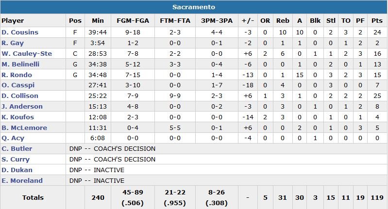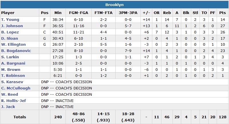 Brooklyn (55.8% de réussite) met au passage fin à une série de 5 défaites en battant son record de 3-points de la saison : 18/28, dont 7 pour Bogdanovic, 5 pour Johnson et 4 pour Donald Sloan (17 points). En face DeMarcus Cousins est en triple-double (24 points, 10 rebonds et 10 passes) mais les Kings, trop absents en défense malgré 25 points de Darren Collison et 15 points et 15 passes de Rajon Rondo, perdent un 6e match en 7 rencontres.