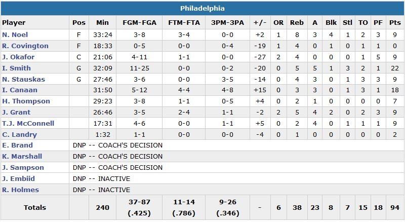 Marcin Gortat ajoute 21 points et 13 rebonds et Bradley Beal termine à 22 points pour sa 1ère titularisation depuis le 9 décembre. Washington, qui restait sur 5 défaites sur ses 6 derniers matchs, n’a jamais été mené dans cette rencontre. Coupé par les Wizards durant le training camp, Ish Smith est le meilleur marqueur des 76ers avec 22 points. Son équipe encaisse un 38-18 (record en saison dans un quart-temps pour les locaux) dans le 3e quart-temps (76-51 en milieu de période). Philadelphie reviendra maximum à 92-83 à 6’13 de la fin du match.