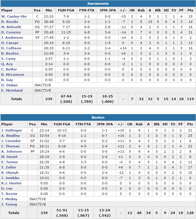 Les C’s ont shooté à 56%, menés par Avery Bradley (25 points à 6/7 à trois points), Isaiah Thomas (22 points à 8/18 et 9 passes) et Jared Sullinger (21 points à 10/13). Le banc a aussi été performant avec 17 points à 6/8 de Tyler Zeller, 11 points d’Evan Turner et 10 de Kelly Olynyk. Les Celtics ont compensé leurs 24 ballons perdus par un 13/24 à trois points. En face les Kings ont été menés par les 31 points de DeMarcus Cousins (à 11/25, 7 rebonds, 6 passes et 5 ballons perdus). Face à son ancienne équipe Rajon Rondo compile 14 points, 15 passes et 6 interceptions.
