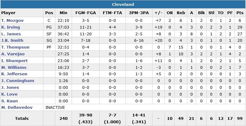 Irving et James ont combiné pour 17 points dans le 4e quart-temps après avoir gâché une avance de 15 points pour la 2e soirée d’affilée. Cleveland était en effet devant 54-39 dans le 2e quart-temps mais les Pelicans, qui perdent un 4e match d’affilée, sont revenus à 4 points (14 points de Cole dans le 3e quart) à plusieurs occasions en seconde mi-temps. New Orleans est ainsi de retour à 74-70 avant de jouer les 12 dernières minutes. J.R. Smith a bien aidé à combler les trous avec 20 points dont 6 shoots à 3-points. Tristan Thompson ne marque de son côté pas un seul point mais capte 15 rebonds en 33 minutes.
