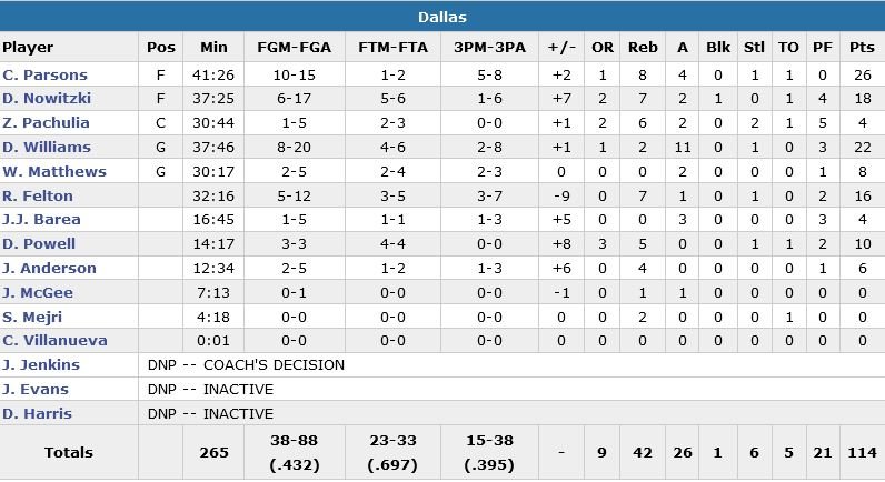 Dirk Nowitzki (18 points) a lui rentré un shoot à 6,40m à 16.6 secondes du buzzer final pour creuser un écart décisif 112-109. Deron Williams ajoute 22 points et 11 passes et Raymond Felton 16 points dont 10 après la mi-temps. Marc Gasol et Zach Randolph ont eux fait la loi dans la raquette avec respectivement 22 points et 6 rebonds et 20 points et 14 rebonds. Matt Barnes termine à 17 points et 11 rebonds et Mike Conley à 16 points et 7 passes.