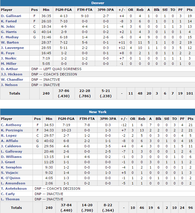 Le rookie termine avec 15 points à 6/18 et 9 passes. Danilo Gallinari a lui shooté à seulement 4/13 pour 19 points, tout comme Will Barton mais à 7/12 en plus de 11 rebonds et 5 passes. Joffrey Lauvergne fait un excellent match en sortie de banc avec 12 points à 5/11 et 10 rebonds. Parmi les clés de la rencontre le fait que Denver n’a perdu que 7 petits ballons en plus de 11 rebonds offensifs. En face Carmelo Anthony était là mais ses 21 points à 7/19 et 7 passes n’ont pas suffi. Kristaps Porzingis ajoute 21 points à 10/23 et 13 rebonds tandis qu’Arron Afflalo marque 15 points.
