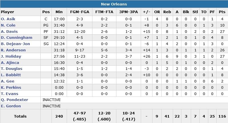 Anthony Davis (12/20, 8 rebonds) et Jrue Holiday (11/23, 6 rebonds et 9 passes) ont chacun inscrit 27 points cette nuit pour mettre fin à une série de 4 défaites des Pelicans, 116-102 face aux Timberwolves.