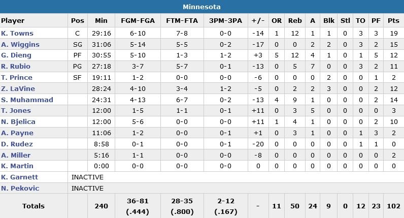 Le rookie et Ricky Rubio prennent chacun 2 fautes dans le 1er quart-temps, forçant Sam Mitchell à utiliser un 5 composé de Zach LaVine, Andre Miller, Shabazz Muhammad, Damjan Rudez et Adreian Payne. New Orleans fait un carnage contre ce groupe de 5 joueurs avec un 14-0 en 3 minutes. Les Wolves ont passé près de 8 minutes sans inscrire le moindre panier.