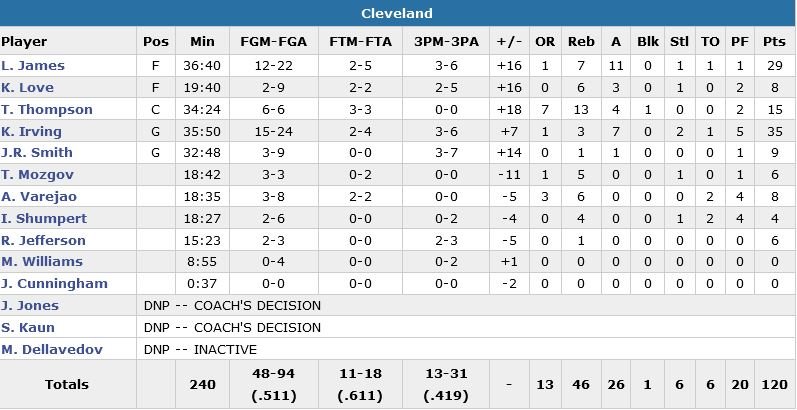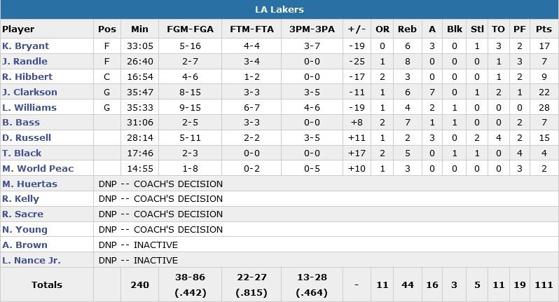 Pour son dernier match à Cleveland, Kobe Bryant a signé 17 points à 5/16, 6 rebonds et 3 passes mais Lou Williams termine meilleur marqueur de Los Angeles (qui perd un 13e match en 15 rencontres) avec 28 points à 9/15. Malgré une avance de 19 points à l’entame du 4e quart-temps, les Cavaliers (seulement 6 ballons perdus) n’ont pas eu tant de facilités que ça à se débarrasser des Californiens. Bryant convertit un 3+1 et rentre 2 lancers-francs pour ramener les siens à 8 points, 108-100, mais J.R. Smith (9 points à 3/9) et James se chargent de mettre fin à cette tentative de comeback à 3-points dans les 3 dernières minutes.