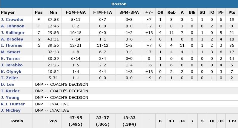 Los Angeles est toujours devant 120-117 à 56 secondes de la fin du temps réglementaire. Thomas provoque la faute sur un layup réussi mais rate son lancer-franc. Sullinger prend le rebond et rentre lui 1 tentative sur 2, 120-118. C’est ensuite au tour de Redick de passer sur la ligne (2/2) et Thomas sur la possession suivante rentre un teardrop qui maintient l’espoir pour Boston. Paul rate ensuite un long shoot alors que l’horloge tourne dangereusement mais Crowder perd le ballon à 23.3 secondes. Jordan est envoyé sur la ligne (0/2) et cela laisse assez de temps à Thomas pour rentrer un fadeaway assassin qui envoie le match en prolongation. Paul aura une dernière chance d’offrir la victoire aux siens dans le 4e quart-temps mais malgré un bon shoot trouvé, celui-ci rebondit sur le cercle au buzzer.