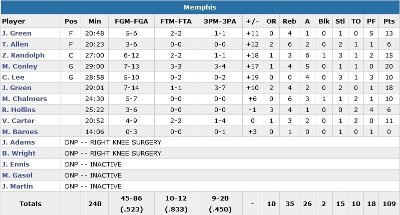 Premier match sans Marc Gasol (fracture du pied) et première victoire pour les Grizzlies cette nuit à Brooklyn, 109-90. Mike Conley termine à 20 points (7/13, 4 rebonds et 5 passes) et Jeff Green inscrit 12 de ses 18 points (7/14) dans le 3e quart-temps dans cette première victoire en 3 matchs pour Memphis, qui restait sur 2 défaites en prolongation contre Dallas et Portland.
