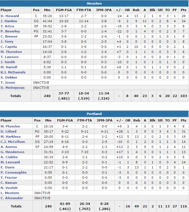 Si Houston a été la première équipe à faire le mini-break en prenant un avantage de 7 points de courte durée en premier quart, les deux équipes ont conclu les 12 premières minutes à égalité 29-29. Houston a démarré le second acte par un 7-2 mais la suite a été bien moins brillante. Ils ont connu un gros passage à vide en attaque, Clint Capela et Dwight Howard ratant leurs lancers suite à du hack-a-Shaq et Portland en a profité pour s’envoler à la faveur d’un 18-3. A la pause les Blazers menaient 57-46 et ils ont fait le break au retour des vestiaires en portant leur avance à 21 points, profitant des ballons perdus texans et d’une bonne adresse. A 4 minutes du début du dernier quart le score était de 86-65, mais tout à coup le match a basculé. Les visiteurs ont marqué 16 points en 3’15 pour faire leur retour à 11 points à la fin du quart et ils ont poursuivi sur leur lancée en début de dernier. Avec deux trois points Jason Terry a réduit l’écart à seulement 5 points. La réponse des Blazers a alors été cinglante puisque Lillard et Henderson ont initié un 14-2 qui a plié le match.