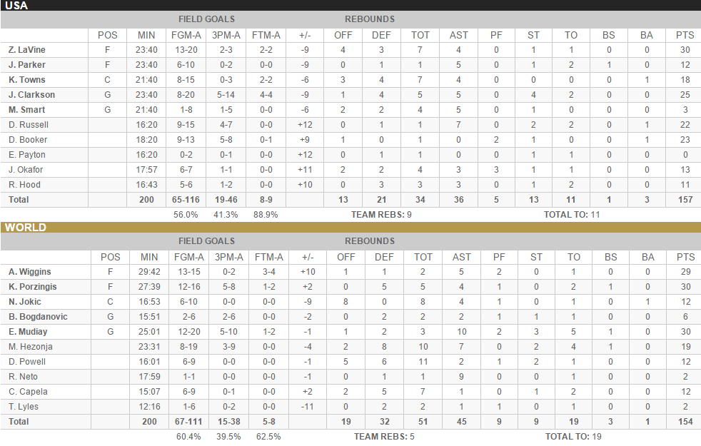 LaVine a été bien aidé par le trio Jordan Clarkson (25 points), D’Angelo Russell (22 points) et Devin Booker (23 points) et en fin de rencontre par son coéquipier Karl-Anthony Towns (18 points). Les deux Wolves ont permis à la sélection mondiale de résister à la tentative de retour des joueurs étrangers sous l’impulsion de Nikola Jokic, Mudiay et Andrew Wiggins (29 points). Ces derniers sotnr evenus à plusieurs reprises à 3 points mais à chaque fois les USA ont répondu.
