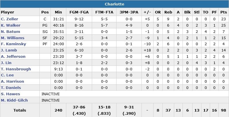 À noter : Al Jefferson a fait son retour après 22 matchs d’absence et une opération du genou droit. Il termine à 6 points et 5 rebonds en 23 minutes.