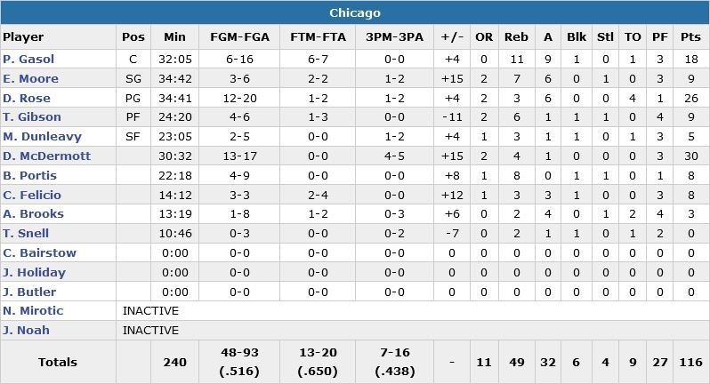 Kyle Lowry termine meilleur marqueur des Raptors (32 passes à 22 à leur avantage) avec 27 points (9/18, 8 passes), Jonas Valanciunas ajoute 25 points et 12 rebonds et DeMar DeRozan 22 points. Chicago shoote à 51.6% (contre 43.2%).