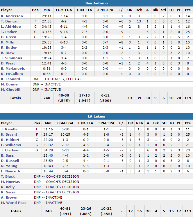 Tony Parker score 25 points à 9/16 en 32 minutes en plus de 6 passes, le même total de points que Kobe Bryant (10/25) mais ce dernier s’est fait une frayeur en se disloquant le doigt (il n’y aurait aucune fracture). 6 autres joueurs des Spurs atteignent les 10 points dont 16 pour LaMarcus Aldridge, 12 pour Tim Duncan (13 rebonds et 3 contres), 14 pour Kyle Anderson, 15 pour Patty Mills et 10 pour Boris Diaw. Les Spurs ont réalisé une grosse performance offensive avec 45.4% aux tirs et 30 passes décisives pour seulement 10 ballons perdus. Difficile dans ses conditions pour les Lakers d’espérer quoi que ce soit mais ils se sont accrochés grâce à leur trio Kobe Bryant, Lou Williams (21 points), Jordan Clarkson (20 points).
