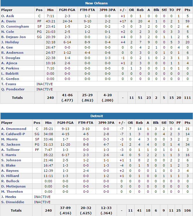 Il a compilé 59 points (record de franchise) à 24/34 dont 2/2 à trois points, 20 rebonds, 4 passes et 1 contre en 43 minutes. Sur les 30 dernières années un seul autre joueur a atteint ces stats: Shaq (61 points et 23 rebonds). Il a été bien aidé par Jrue Holiday (20 points, 7 rebonds et 9 passes). Derrière c’est le désert mais Davis était trop fort pour Detroit et il a inscrit pas moins de 19 points dans le dernier acte pour faire la différence dans un match serré pendant 40 minutes. En face Reggie Jackson (34 points à 11/20) et Andre Drummond (21 points à 9/13 et 14 rebonds) ont tout tenté mais ils n’ont rien pu faire, la défense n’ayant jamais réussi à ralentir Davis. A noter les 16 points de Tobias Harris mais à 6/17 et les 14 points à 4/15 de Kentavious Caldwell-Pope.
