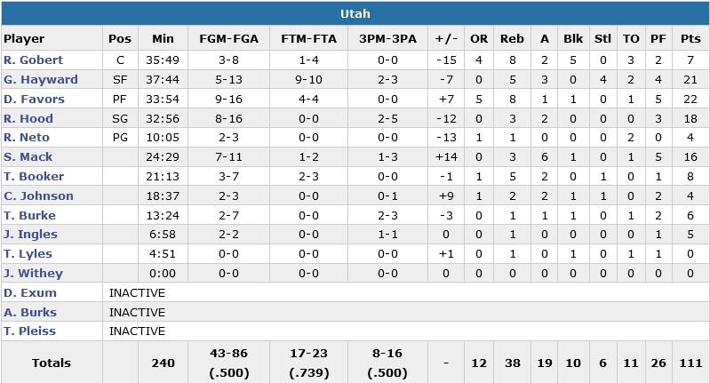 Mo Harkless ajoute 17 points (5/9, 7 rebonds) et Ed Davis 11 points à 4/4 en sortie de banc. Derrick Favors a mené Utah avec 22 points à 9/16 et 8 rebonds, suivi de près par Gordon Hayward et ses 21 points à 5/13, 5 rebonds et 3 passe. Rudy Gobert est lui limité à 3/8 pour 7 points, 8 rebonds, 2 passes et 5 contres au total dans cette 3e défaite en 4 matchs du Jazz malgré un large avantage au pourcentage de réussite (50% au global contre 43.3% pour Portland, 17/23 aux lancers-francs contre 25/38 et 8/16 à 3-points contre 12/32).